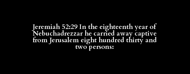 Jeremiah 52:29 In the eighteenth year of Nebuchadrezzar he carried away captive from Jerusalem eight hundred thirty and two persons: