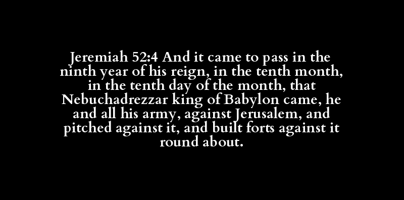 Jeremiah 52:4 And it came to pass in the ninth year of his reign, in the tenth month, in the tenth day of the month, that Nebuchadrezzar king of Babylon came, he and all his army, against Jerusalem, and pitched against it, and built forts against it round about.