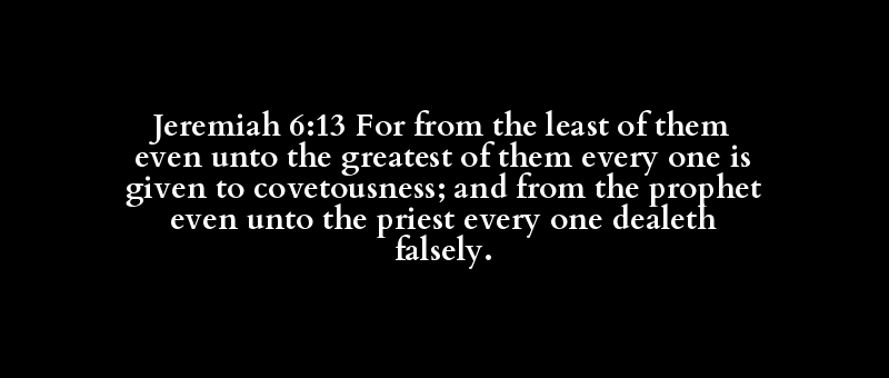 Jeremiah 6:13 For from the least of them even unto the greatest of them every one is given to covetousness; and from the prophet even unto the priest every one dealeth falsely.