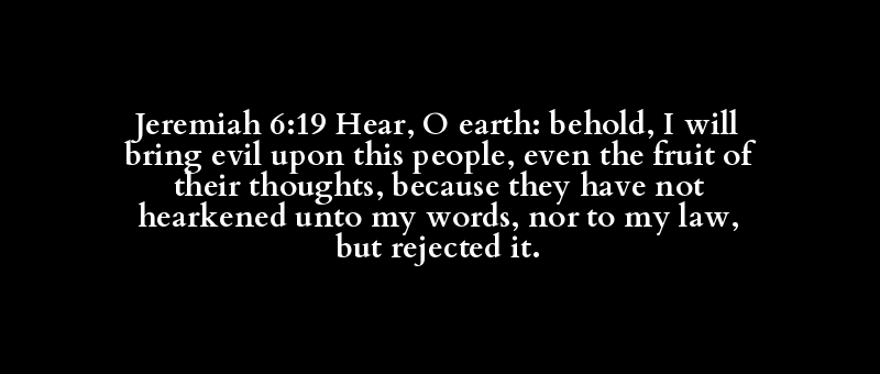 Jeremiah 6:19 Hear, O earth: behold, I will bring evil upon this people, even the fruit of their thoughts, because they have not hearkened unto my words, nor to my law, but rejected it.