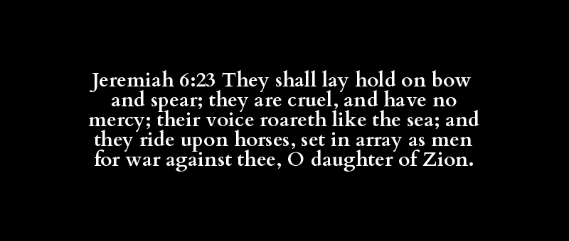 Jeremiah 6:23 They shall lay hold on bow and spear; they are cruel, and have no mercy; their voice roareth like the sea; and they ride upon horses, set in array as men for war against thee, O daughter of Zion.