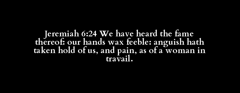 Jeremiah 6:24 We have heard the fame thereof: our hands wax feeble: anguish hath taken hold of us, and pain, as of a woman in travail.