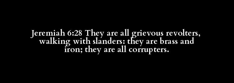Jeremiah 6:28 They are all grievous revolters, walking with slanders: they are brass and iron; they are all corrupters.