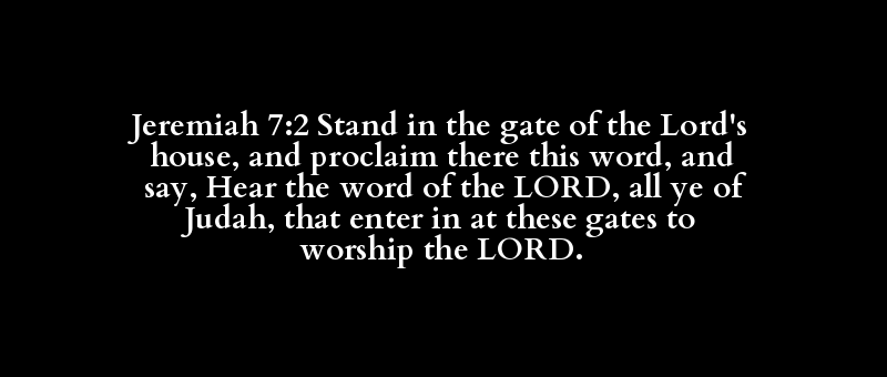 Jeremiah 7:2 Stand in the gate of the Lord's house, and proclaim there this word, and say, Hear the word of the LORD, all ye of Judah, that enter in at these gates to worship the LORD.