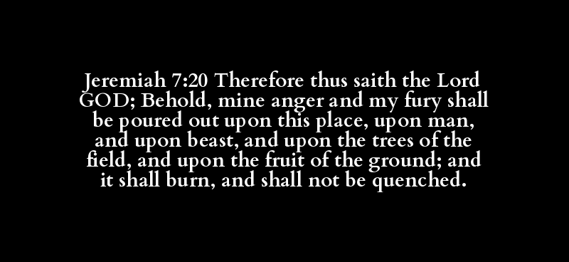 Jeremiah 7:20 Therefore thus saith the Lord GOD; Behold, mine anger and my fury shall be poured out upon this place, upon man, and upon beast, and upon the trees of the field, and upon the fruit of the ground; and it shall burn, and shall not be quenched.