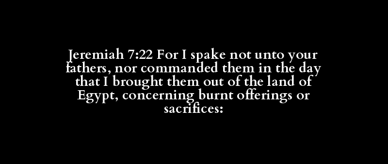 Jeremiah 7:22 For I spake not unto your fathers, nor commanded them in the day that I brought them out of the land of Egypt, concerning burnt offerings or sacrifices: