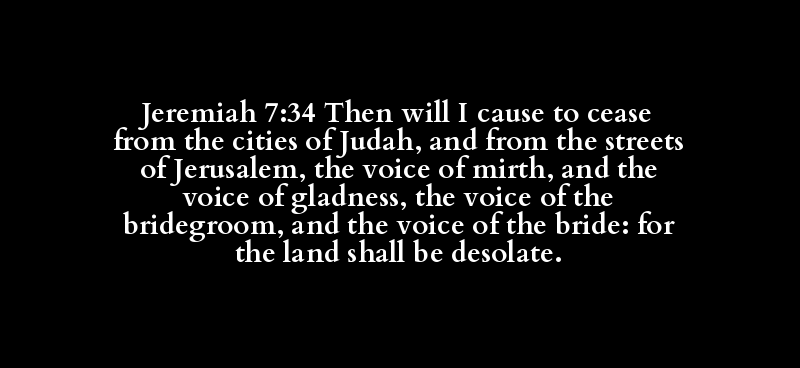 Jeremiah 7:34 Then will I cause to cease from the cities of Judah, and from the streets of Jerusalem, the voice of mirth, and the voice of gladness, the voice of the bridegroom, and the voice of the bride: for the land shall be desolate.