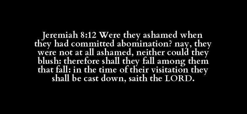 Jeremiah 8:12 Were they ashamed when they had committed abomination? nay, they were not at all ashamed, neither could they blush: therefore shall they fall among them that fall: in the time of their visitation they shall be cast down, saith the LORD.