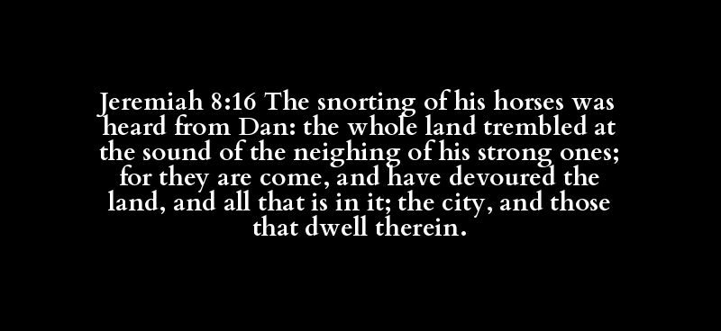 Jeremiah 8:16 The snorting of his horses was heard from Dan: the whole land trembled at the sound of the neighing of his strong ones; for they are come, and have devoured the land, and all that is in it; the city, and those that dwell therein.