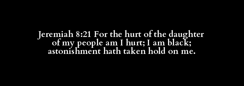 Jeremiah 8:21 For the hurt of the daughter of my people am I hurt; I am black; astonishment hath taken hold on me.