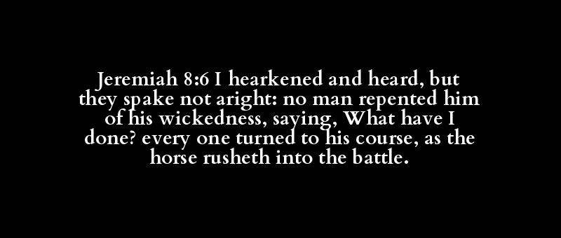 Jeremiah 8:6 I hearkened and heard, but they spake not aright: no man repented him of his wickedness, saying, What have I done? every one turned to his course, as the horse rusheth into the battle.