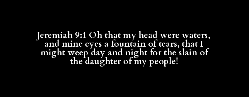 Jeremiah 9:1 Oh that my head were waters, and mine eyes a fountain of tears, that I might weep day and night for the slain of the daughter of my people!