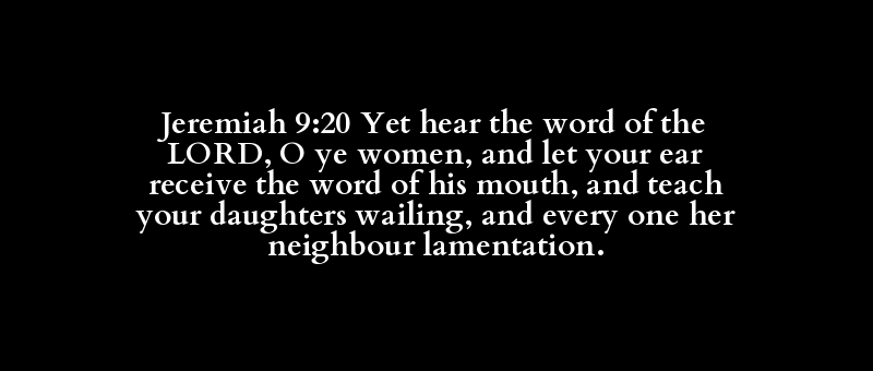 Jeremiah 9:20 Yet hear the word of the LORD, O ye women, and let your ear receive the word of his mouth, and teach your daughters wailing, and every one her neighbour lamentation.