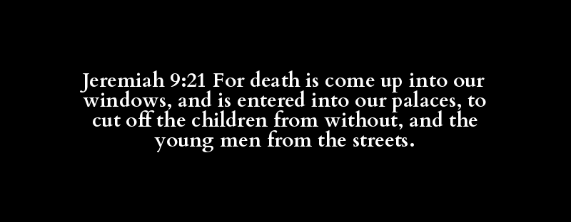 Jeremiah 9:21 For death is come up into our windows, and is entered into our palaces, to cut off the children from without, and the young men from the streets.