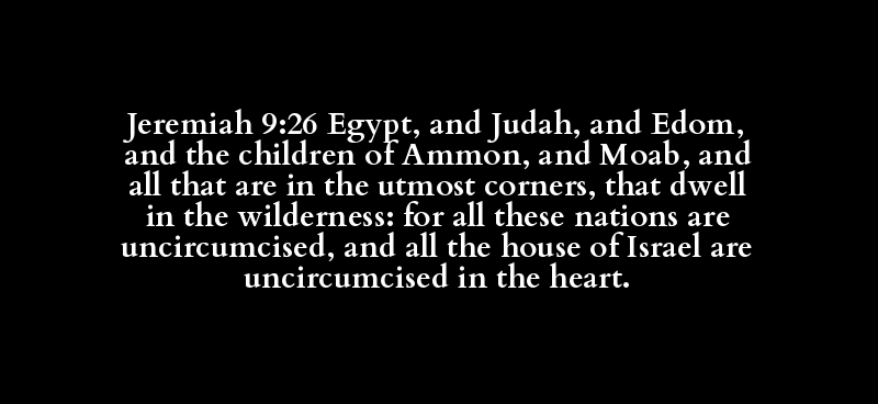 Jeremiah 9:26 Egypt, and Judah, and Edom, and the children of Ammon, and Moab, and all that are in the utmost corners, that dwell in the wilderness: for all these nations are uncircumcised, and all the house of Israel are uncircumcised in the heart.