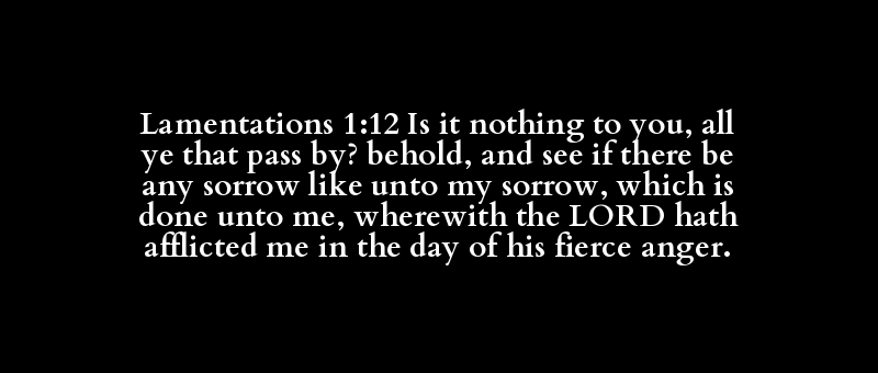 Lamentations 1:12 Is it nothing to you, all ye that pass by? behold, and see if there be any sorrow like unto my sorrow, which is done unto me, wherewith the LORD hath afflicted me in the day of his fierce anger.