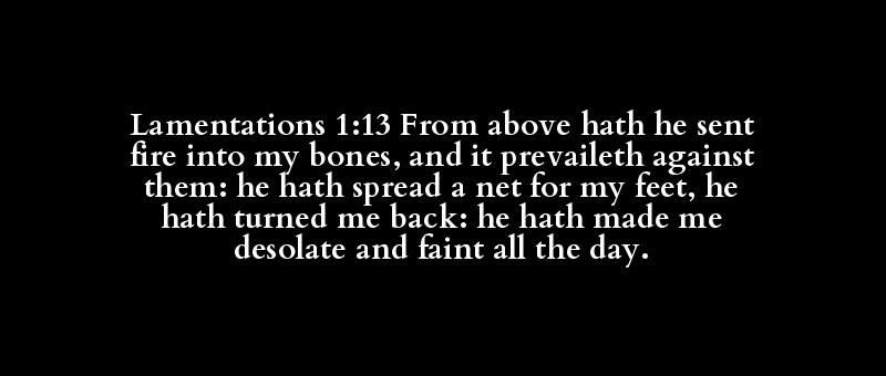 Lamentations 1:13 From above hath he sent fire into my bones, and it prevaileth against them: he hath spread a net for my feet, he hath turned me back: he hath made me desolate and faint all the day.