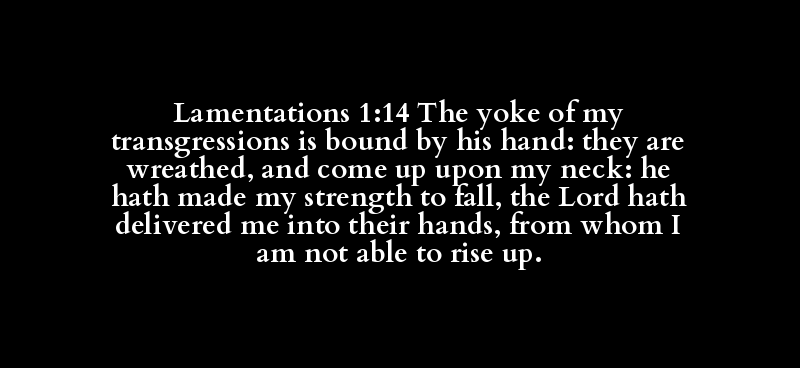 Lamentations 1:14 The yoke of my transgressions is bound by his hand: they are wreathed, and come up upon my neck: he hath made my strength to fall, the Lord hath delivered me into their hands, from whom I am not able to rise up.