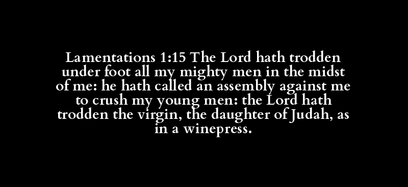 Lamentations 1:15 The Lord hath trodden under foot all my mighty men in the midst of me: he hath called an assembly against me to crush my young men: the Lord hath trodden the virgin, the daughter of Judah, as in a winepress.