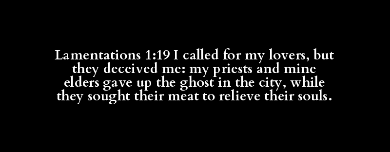 Lamentations 1:19 I called for my lovers, but they deceived me: my priests and mine elders gave up the ghost in the city, while they sought their meat to relieve their souls.