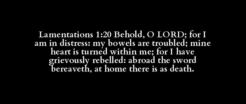 Lamentations 1:20 Behold, O LORD; for I am in distress: my bowels are troubled; mine heart is turned within me; for I have grievously rebelled: abroad the sword bereaveth, at home there is as death.