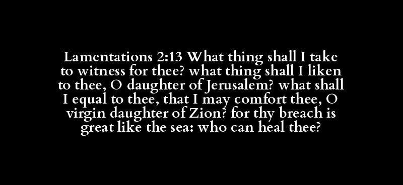 Lamentations 2:13 What thing shall I take to witness for thee? what thing shall I liken to thee, O daughter of Jerusalem? what shall I equal to thee, that I may comfort thee, O virgin daughter of Zion? for thy breach is great like the sea: who can heal thee?