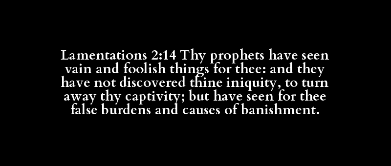 Lamentations 2:14 Thy prophets have seen vain and foolish things for thee: and they have not discovered thine iniquity, to turn away thy captivity; but have seen for thee false burdens and causes of banishment.