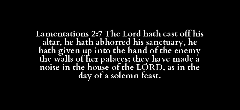 Lamentations 2:7 The Lord hath cast off his altar, he hath abhorred his sanctuary, he hath given up into the hand of the enemy the walls of her palaces; they have made a noise in the house of the LORD, as in the day of a solemn feast.