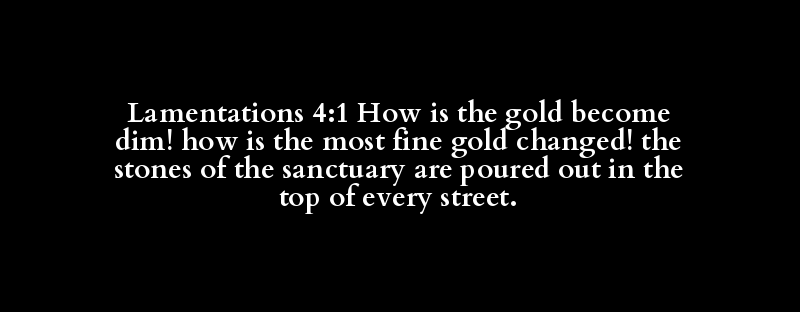 Lamentations 4:1 How is the gold become dim! how is the most fine gold changed! the stones of the sanctuary are poured out in the top of every street.