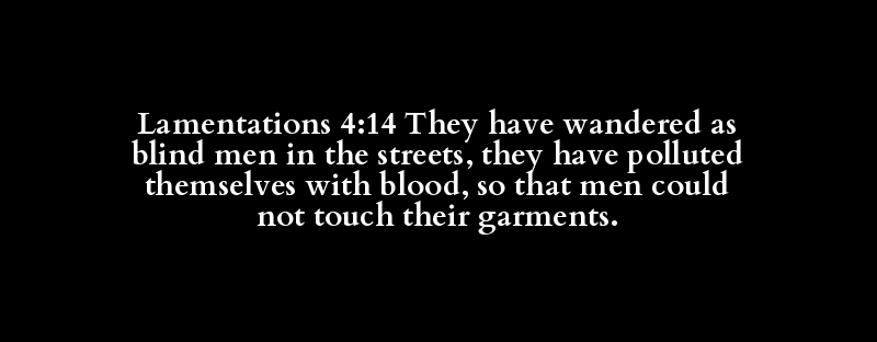 Lamentations 4:14 They have wandered as blind men in the streets, they have polluted themselves with blood, so that men could not touch their garments.