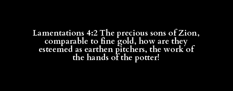 Lamentations 4:2 The precious sons of Zion, comparable to fine gold, how are they esteemed as earthen pitchers, the work of the hands of the potter!