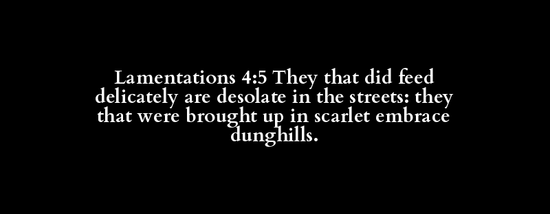Lamentations 4:5 They that did feed delicately are desolate in the streets: they that were brought up in scarlet embrace dunghills.