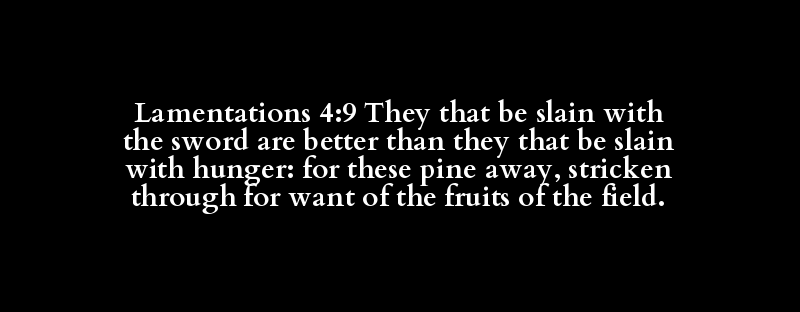 Lamentations 4:9 They that be slain with the sword are better than they that be slain with hunger: for these pine away, stricken through for want of the fruits of the field.