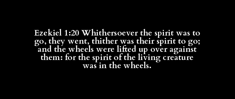 Ezekiel 1:20 Whithersoever the spirit was to go, they went, thither was their spirit to go; and the wheels were lifted up over against them: for the spirit of the living creature was in the wheels.