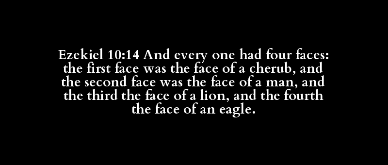 Ezekiel 10:14 And every one had four faces: the first face was the face of a cherub, and the second face was the face of a man, and the third the face of a lion, and the fourth the face of an eagle.
