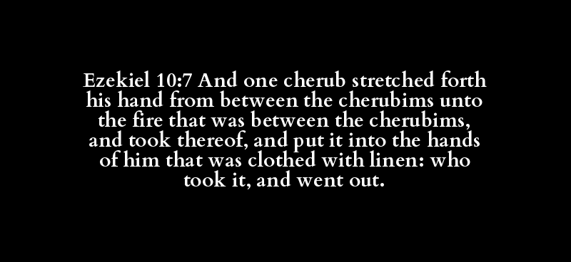 Ezekiel 10:7 And one cherub stretched forth his hand from between the cherubims unto the fire that was between the cherubims, and took thereof, and put it into the hands of him that was clothed with linen: who took it, and went out.