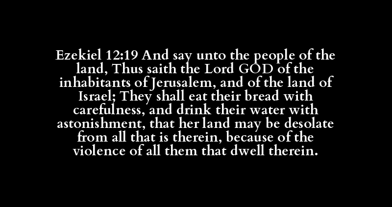 Ezekiel 12:19 And say unto the people of the land, Thus saith the Lord GOD of the inhabitants of Jerusalem, and of the land of Israel; They shall eat their bread with carefulness, and drink their water with astonishment, that her land may be desolate from all that is therein, because of the violence of all them that dwell therein.