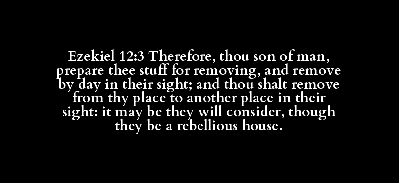 Ezekiel 12:3 Therefore, thou son of man, prepare thee stuff for removing, and remove by day in their sight; and thou shalt remove from thy place to another place in their sight: it may be they will consider, though they be a rebellious house.