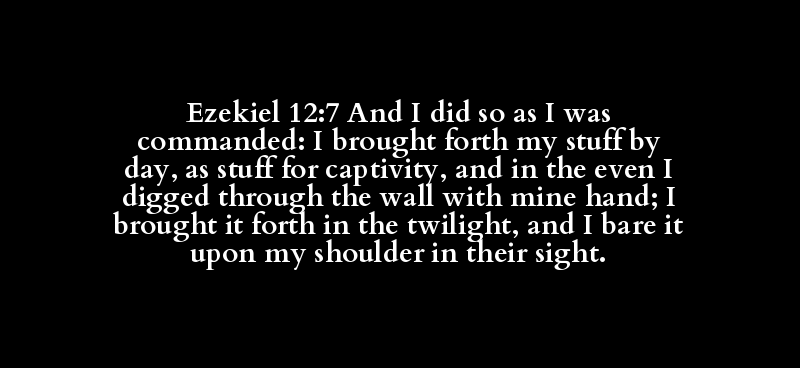 Ezekiel 12:7 And I did so as I was commanded: I brought forth my stuff by day, as stuff for captivity, and in the even I digged through the wall with mine hand; I brought it forth in the twilight, and I bare it upon my shoulder in their sight.
