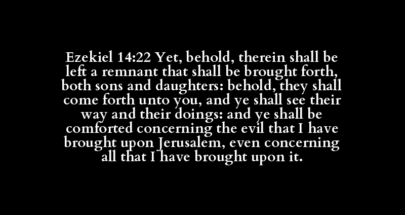 Ezekiel 14:22 Yet, behold, therein shall be left a remnant that shall be brought forth, both sons and daughters: behold, they shall come forth unto you, and ye shall see their way and their doings: and ye shall be comforted concerning the evil that I have brought upon Jerusalem, even concerning all that I have brought upon it.
