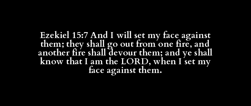 Ezekiel 15:7 And I will set my face against them; they shall go out from one fire, and another fire shall devour them; and ye shall know that I am the LORD, when I set my face against them.