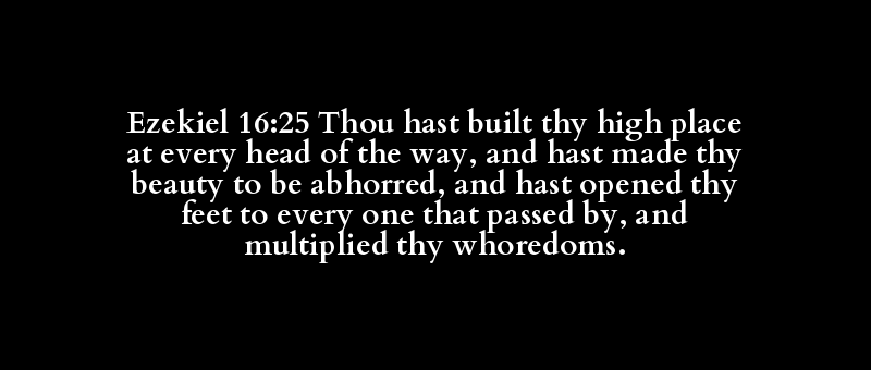Ezekiel 16:25 Thou hast built thy high place at every head of the way, and hast made thy beauty to be abhorred, and hast opened thy feet to every one that passed by, and multiplied thy whoredoms.