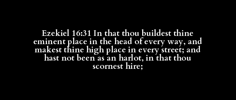 Ezekiel 16:31 In that thou buildest thine eminent place in the head of every way, and makest thine high place in every street; and hast not been as an harlot, in that thou scornest hire;