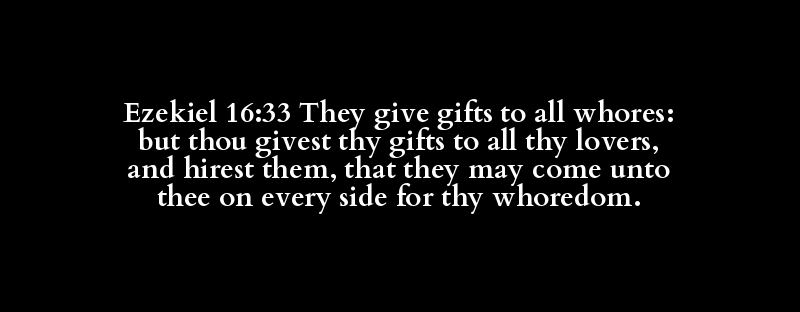 Ezekiel 16:33 They give gifts to all whores: but thou givest thy gifts to all thy lovers, and hirest them, that they may come unto thee on every side for thy whoredom.