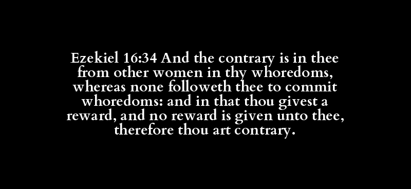 Ezekiel 16:34 And the contrary is in thee from other women in thy whoredoms, whereas none followeth thee to commit whoredoms: and in that thou givest a reward, and no reward is given unto thee, therefore thou art contrary.