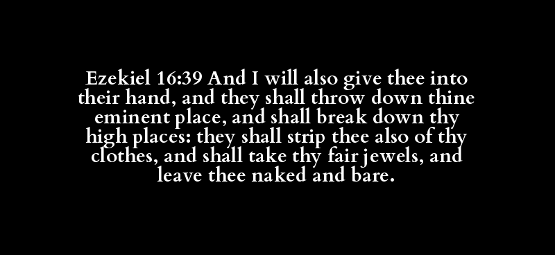 Ezekiel 16:39 And I will also give thee into their hand, and they shall throw down thine eminent place, and shall break down thy high places: they shall strip thee also of thy clothes, and shall take thy fair jewels, and leave thee naked and bare.