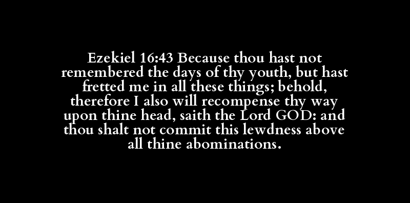 Ezekiel 16:43 Because thou hast not remembered the days of thy youth, but hast fretted me in all these things; behold, therefore I also will recompense thy way upon thine head, saith the Lord GOD: and thou shalt not commit this lewdness above all thine abominations.