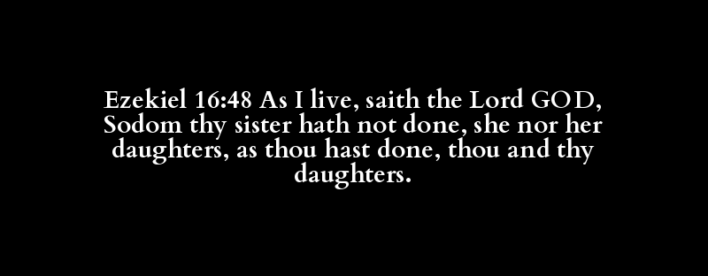 Ezekiel 16:48 As I live, saith the Lord GOD, Sodom thy sister hath not done, she nor her daughters, as thou hast done, thou and thy daughters.
