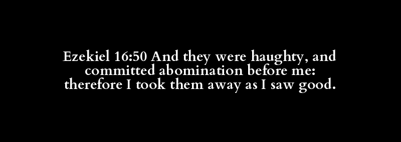 Ezekiel 16:50 And they were haughty, and committed abomination before me: therefore I took them away as I saw good.