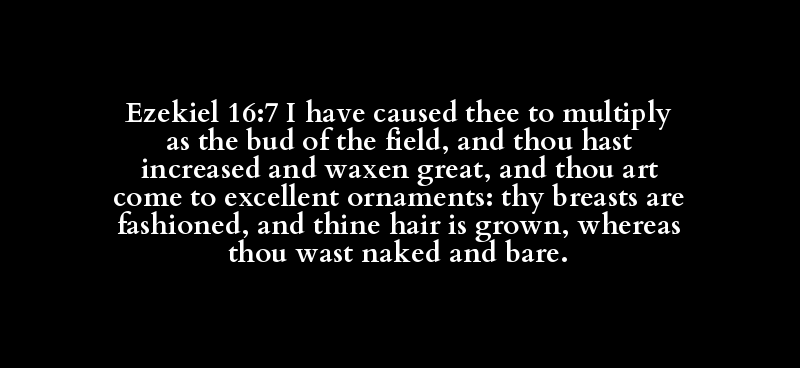 Ezekiel 16:7 I have caused thee to multiply as the bud of the field, and thou hast increased and waxen great, and thou art come to excellent ornaments: thy breasts are fashioned, and thine hair is grown, whereas thou wast naked and bare.